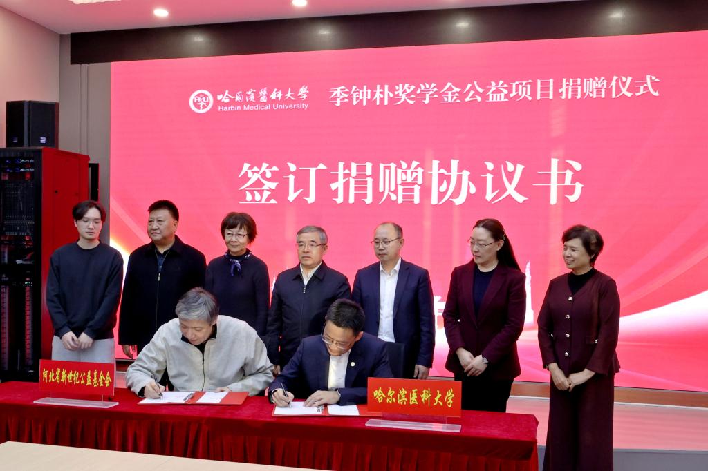 仪式以纪念视频《高山景行大师风范》启幕,全面回顾了老校长季钟朴波澜壮阔的一生与光风霁月的大师风范。随后,在双方人员的共同见证下,李小龙理事长与季勇校长签署了捐赠协议,完成了捐赠支票牌交接与纪念铭牌颁发仪式。李小龙先生表示,父亲的精神始终与哈医大紧密相连,他期盼这份奖学金能如一颗种子,激励新一代哈医学子续写时代华章。2024级临床医学专业本科生刘桥柱同学作为学生代表发言,表达了续写老校长未竟事业,传承薪火的决心。张学代表学校致辞,表示将珍视并善用这份捐赠,确保资金用于激励最具潜力的医学人才,使其成为百年学府薪火相传、培育栋梁的生动见证。