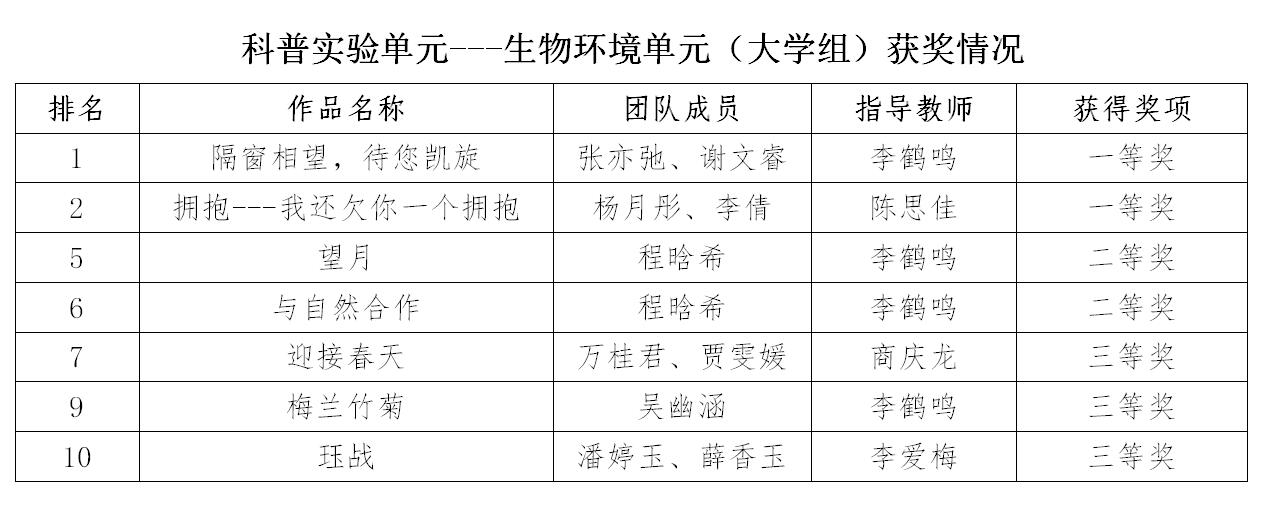 我校学生参加了生物环境和未来教育两个单元比赛,参赛选手在竞赛中表现突出,取得优异成绩,获生物环境单元一等奖2项,二等奖2项,三等奖3项,未来教育单元二等奖1项,三等奖2项。其中生物环境单元参赛作品“隔窗相望,带您凯旋”将代表“黑龙江-吉林”赛区参加6月份举行的全国决赛。