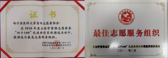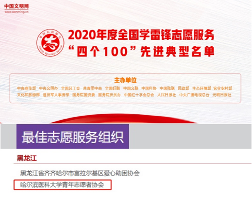 日前,中央宣传部、中央文明办等部门和单位共同组织开展2020年度全国学雷锋志愿服务“四个100”先进典型宣传推选活动,我校青年志愿者协会荣获2020年全国学雷锋“四个100”最佳志愿服务组织称号,是黑龙江省2个入选组织之一。