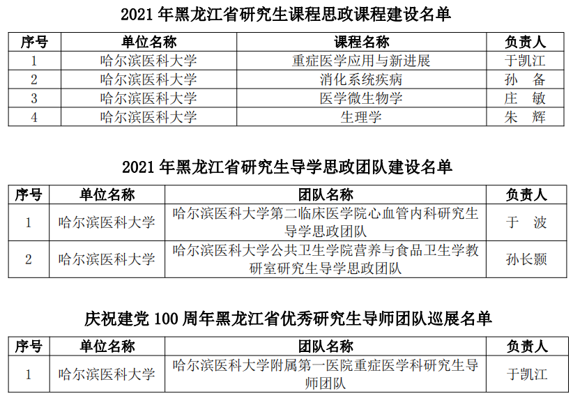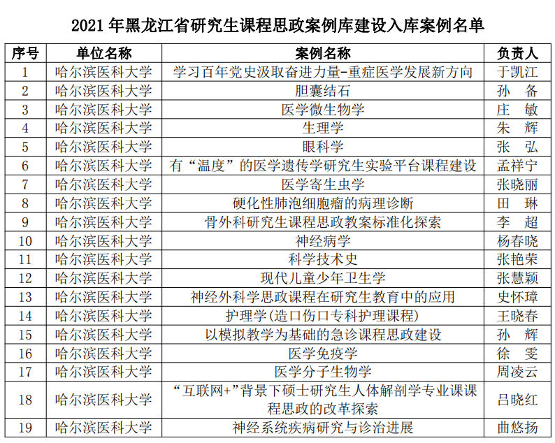 为贯彻落实国家《关于全面落实研究生导师立德树人职责的意见》《高等学校课程思政建设指导纲要》《关于加快新时代研究生教育改革发展的意见》精神,按照《关于加快新时代黑龙江省研究生教育改革发展的实施意见》要求,日前,经全省研究生培养单位遴选推荐,黑龙江省研究生课程思政教育联盟专家委员会评审,省学位委员会、省教育厅批准,我校共有26个项目获批省级立项,其中研究生课程思政课程建设项目4个、研究生导学思政团队(导师)建设项目2个、研究生课程思政案例19个,庆祝建党100周年巡展优秀研究生导师团队1支。
