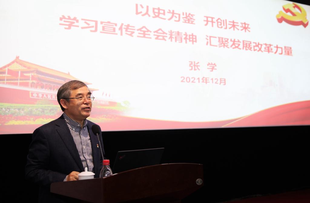 张学首先结合习近平总书记在党史学习教育动员大会和庆祝中国共产党成立100周年大会上的重要讲话,对党的十九届六中全会重要意义进行阐释。他指出,党史学习教育动员大会上,习近平总书记在讲话中提出了在重要历史关头开展党史学习教育的目的和意义:以史为鉴、开创未来。在庆祝中国共产党成立100周年大会上,习近平总书记明确指出以史为鉴、开创未来的任务和要求。而党的十九届六中全会最重要的成果《中共中央关于党的百年奋斗重大成就和历史经验的决议》(以下简称《决议》)则为“以史为鉴、开创未来”提供了根本遵循和行动指南。他表示,要把习近平总书记在党史学习教育动员大会、庆祝中国共产党成立100周年大会上的重要讲话和党的十九届六中全会精神结合起来,联系起来深入学习。在当前这个时期,要将学习宣传贯彻党的十九届六中全会精神作为党史学习教育的首要任务,不断领悟以史为鉴、开创未来的重要要求,真正做到党史学习教育落地见效,从党的百年奋斗重大成就和历史经验中汲取磅礴力量,推动学校各项改革事业高质量发展。