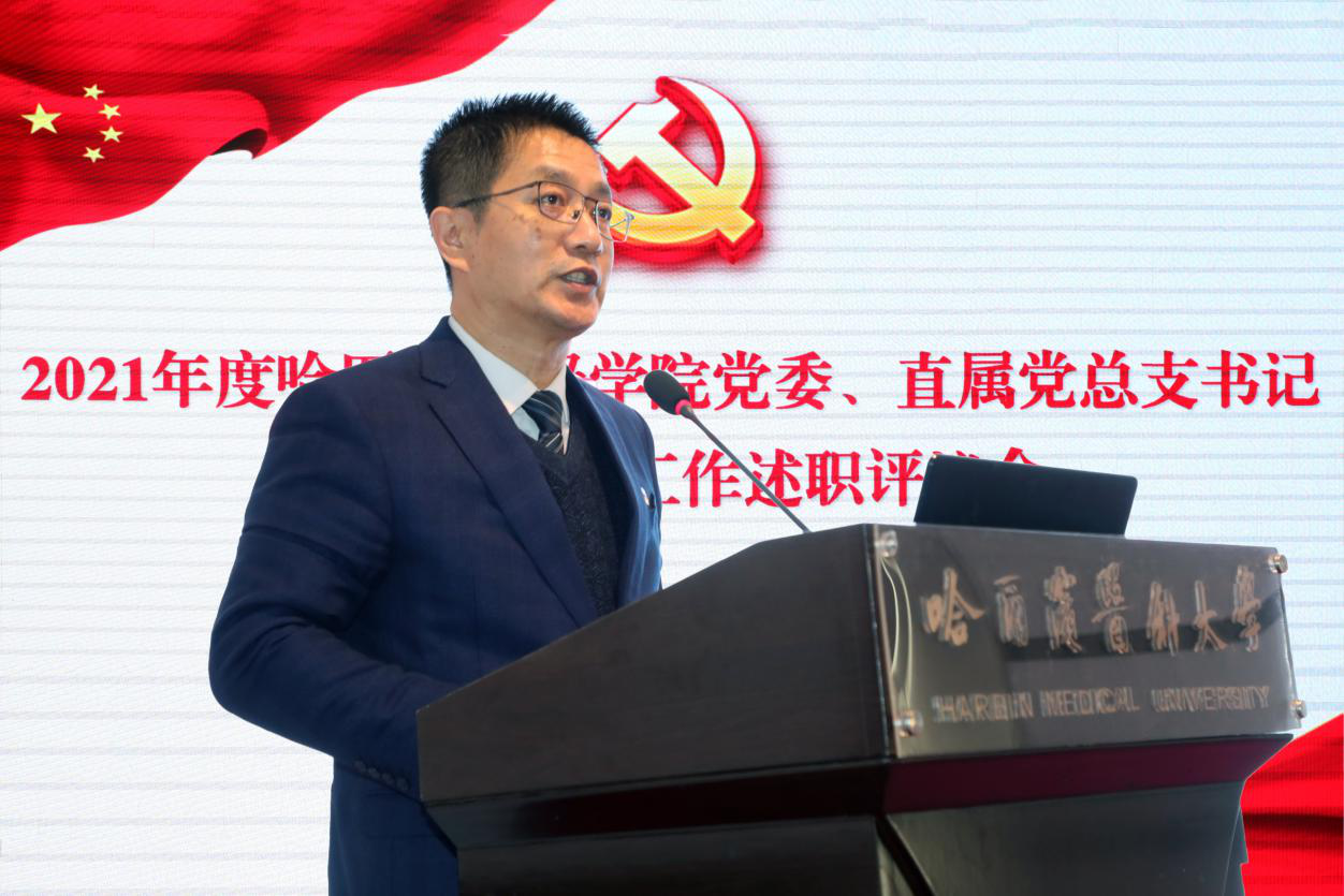 听取述职后,张斌在总结讲话中对全校各二级党组织书记2021年度抓基层党建工作给予了充分肯定。2021年,学校各基层党组织强化政治统领、践行医者初心、树牢民本情怀、深化强基工程,分别在筑牢思想根基上下了“实功”、在抗击新冠疫情上用了“实劲”、在为民服务解忧上出了“实招”、在党建工作成果上见了“实效”。结合学校发展与基层党建工作实际,对标教育部“双创”工作中院系党组织建设的有关内容,张斌提出四点工作要求。一是坚持旗帜鲜明讲政治,不断强化基层党组织政治功能。要坚定不移把“两个维护”作为最高政治原则和根本政治规矩,切实把牢政治方向、提高政治站位、扛起政治责任,不断提高政治判断力、政治领悟力、政治执行力。二是坚持立德树人,充分发挥基层党组织战斗堡垒作用。要坚持把党建工作与思政工作结合起来,把思想政治工作贯穿教育教学全过程,严格落实意识形态工作责任制,开启思想政治工作新气象新局面。三是坚持围绕中心,推动基层党建提质增效。要对标新时代要求,强化与巩固“大抓基层、大抓支部”的鲜明导向,在党支部标准化规范化建设上、在增强党建工作生机活力上、在推动党建业务融合上持续发力。四是坚持全面从严治党,形成齐抓共管的基层党建工作格局。要牢固树立抓好党建是最大政绩的理念,认真贯彻新时代党的组织路线,始终坚持“严”的主基调,加强党对人才工作的全面领导,切实推动基层党建各项任务落到实处。