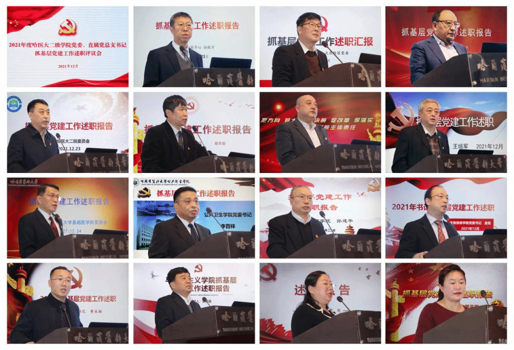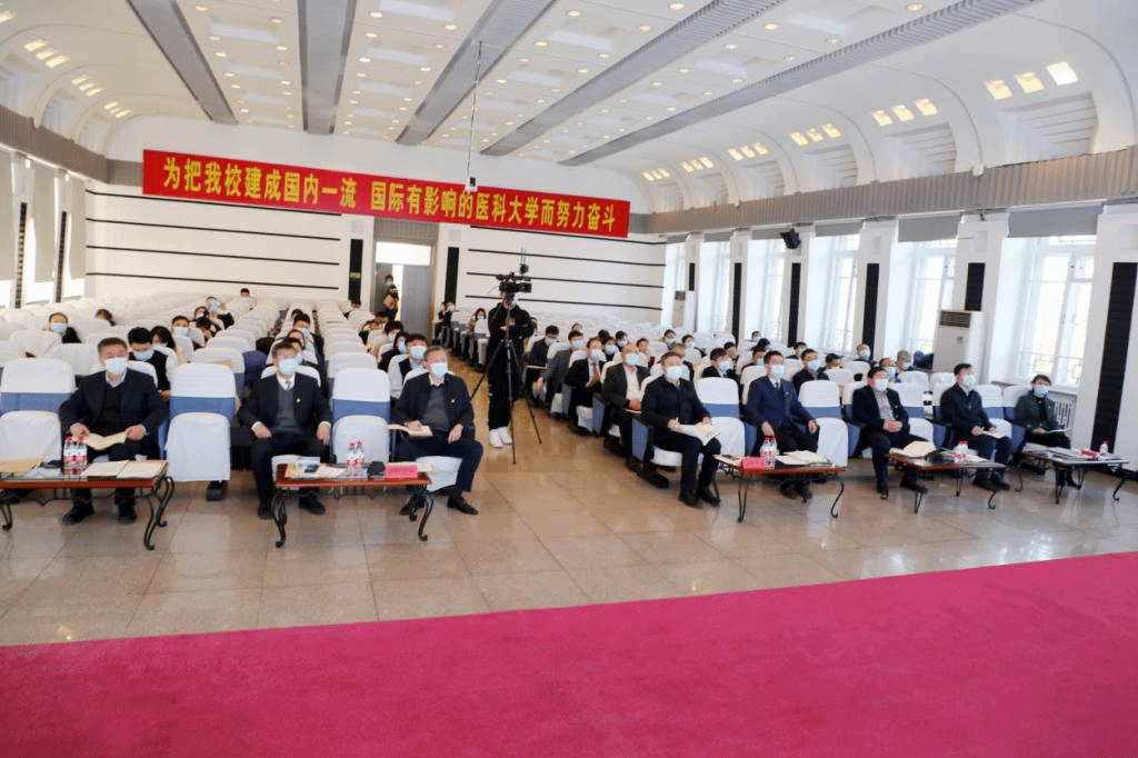 12月23日,学校党委召开了2021年度二级学院党委、直属党总支书记抓基层党建工作述职评议大会。学校领导班子成员,二级学院党委书记、直属党总支书记、副书记,学校党群部门副处级以上干部,组工干部、专职组织员、党支部书记代表、教职工党员代表共计100余人参加会议。本次会议采取线上线下相结合的方式开展,学校领导、述职人员和附属医院人员在主楼三楼会议厅参会,其他院系人员在主楼基础厅通过网络直播同步观看。学校党委书记张斌出席会议并讲话。会议由学校党委副书记兼工会主席贺景平主持。