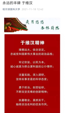 2021年11月18日,学校官微推出了于维汉院士百年诞辰纪念文章,播出了离退休老干部处录制的弘扬于维汉精神的诗朗诵,团委学生录制的演绎于维汉感人事迹的校史话剧,让师生们再一次感受到于维汉精神在一代代哈医大人身上的薪火相传,激励他们坚定传承和发扬,担当使命,接好奋进新时代的“接力棒”。