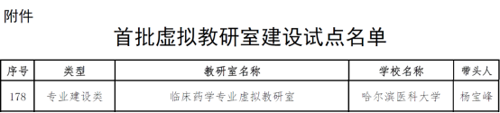 “临床药学专业虚拟教研室”属于专业建设类虚拟教研室,哈尔滨医科大学为牵头单位,杨宝峰院士为带头人,由15所国内知名医药院校联合组成,是全国首家临床药学专业虚拟教研室。虚拟教研室是信息化时代新型基层教育组织建设的重要探索,旨在依托虚拟教研室,推动教师加强对专业建设、课程实施、教学内容、教学方法、教学手段、教学评价等方面的研究探索,提升教学研究的意识,建强基层教学组织,引导教师回归教学、热爱教学、研究教学,为高等教育高质量发展提供有力支撑。