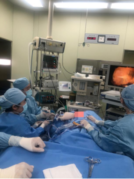 张建国带领团队在术前进行了充分的病情分析、腺体的标记与测量、手术方式和预案的准备。乳腺腔镜手术如期进行,在全身麻醉后,张建国带领副主任陈晰教授、梁文龙、王瑶主治医师的腔镜团队在术中使用自研“乳腺单孔腔镜戳卡”进行操作,采用“逆序法”切除全部腺体,并完整保留乳头乳晕。手术过程中无需任何溶脂即可成功构建气腔、完整暴露癌变区域,随后使用超声刀切除皮下腺体。由于腔镜的放大作用,术中可以精准的保护或处理乳头下细小的血管、神经,保证乳头的血运和部分感觉。