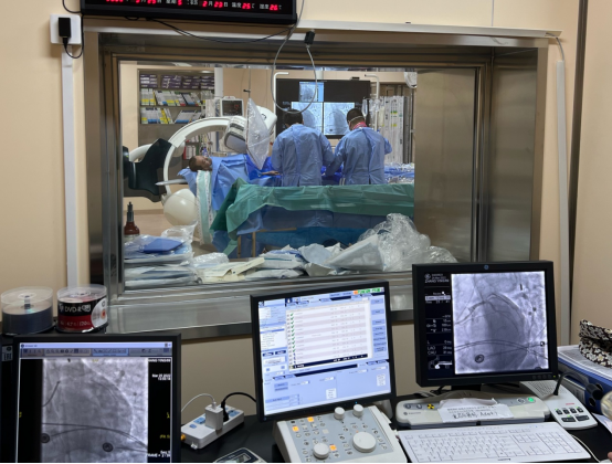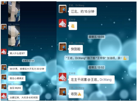 在从江北患者家中送往医院的路上,急救医生就将心电图发到哈医大一院胸痛中心微信群里,医生会诊后即启动导管室做好手术准备。到医院后,在无核酸结果的情况下,张先生直接被推进急诊负一层的负压导管室,而此时张先生已有心率减慢、血压下降状况。经紧急冠脉造影后发现,冠状动脉左主干尾部被一个大血栓阻塞,远端完全闭塞。在非常凶险情况下,医师立即为他植入IABP(主动脉内球囊反搏装置)以维持血压,并在IABP保护下行冠脉内血栓抽吸和支架植入术,几分钟后张先生的血管被开通,命总算被救了回来。患者入医院大门到导丝通过病变时间仅为30分钟,而从急救医生接触患者到导丝通过病变时间也仅为50余分钟。