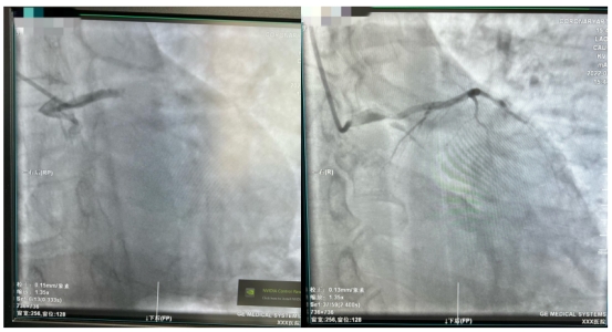 到达医院后,刘先生在无核酸报告的情况下被推到负压导管室,紧急造影显示为左主干尾部90%狭窄,前降支近端90%狭窄并血栓影,回旋支完全闭塞。刘先生在IABP保护下成功进行了左主干血管开通,入医院大门到导丝通过病变时间仅为29分钟。