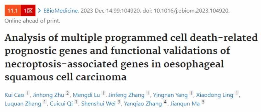 近日,哈医大肿瘤医院马建群教授课题组在食管鳞状细胞癌(oesophageal squamous cell carcinoma, ESCC)生物标志物领域取得最新进展,其研究成果论文《食管鳞状细胞癌中多种程序性细胞死亡相关预后基因的分析和程序性坏死相关基因的功能验证》被国际高水平期刊EBioMedicine收录并正式发表,该期刊影响因子为11.10。