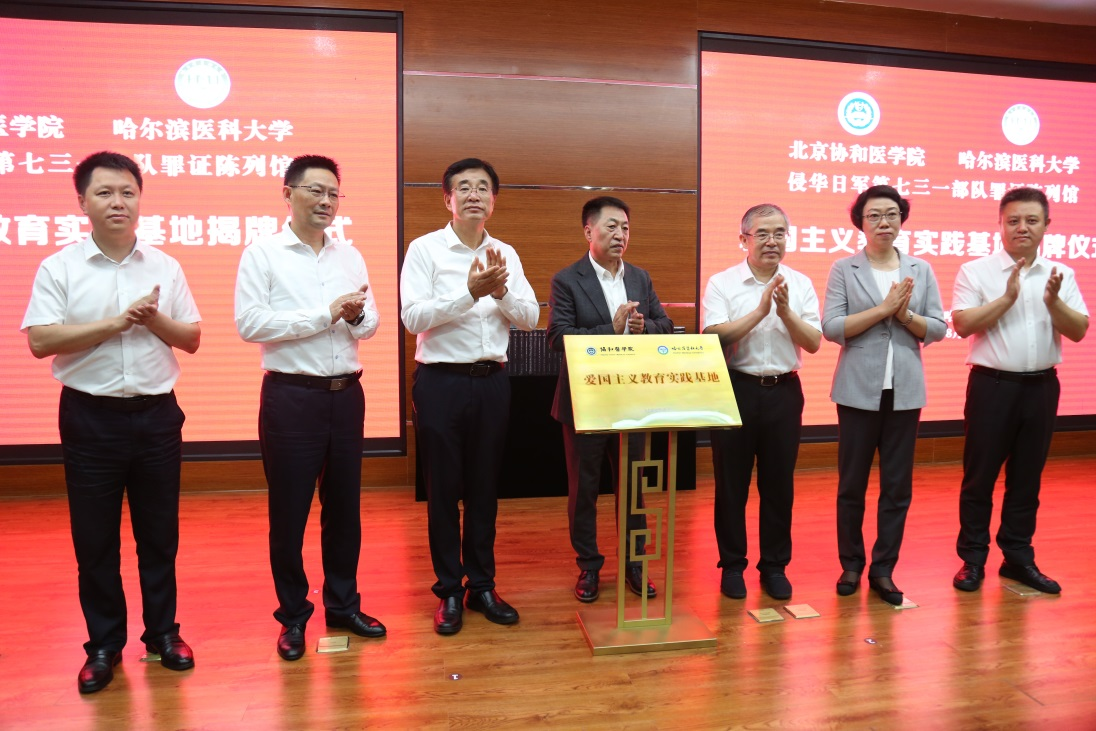 经过前期的筹备,8月2日下午,在哈尔滨市侵华日军第七三一部队罪证陈列馆报告厅,在省市有关领导、陈列馆相关人员和两校师生的见证下,中国工程院副院长、中国医学科学院北京协和医学院院校长王辰院士,哈尔滨医科大学党委书记、中国工程院张学院士,市委常委、哈尔滨新区党工委副书记、平房区委书记闫红蕾,哈尔滨医科大学校长季勇,省委宣传部副部长尚铁权,哈尔滨市文化广电和旅游局党组书记、局长王洪新,侵华日军第七三一部队罪证陈列馆馆长、国家二级研究员金成民共同为共建爱国主义教育实践基地揭牌,侵华日军第七三一部队罪证陈列馆向北京协和医学院、哈尔滨医科大学捐赠图书资料。