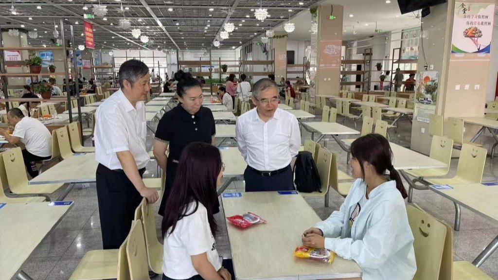学校领导深入食堂实地察看餐饮质量、就餐环境等情况,与报到的新生和家长亲切交流,倾听意见建议。