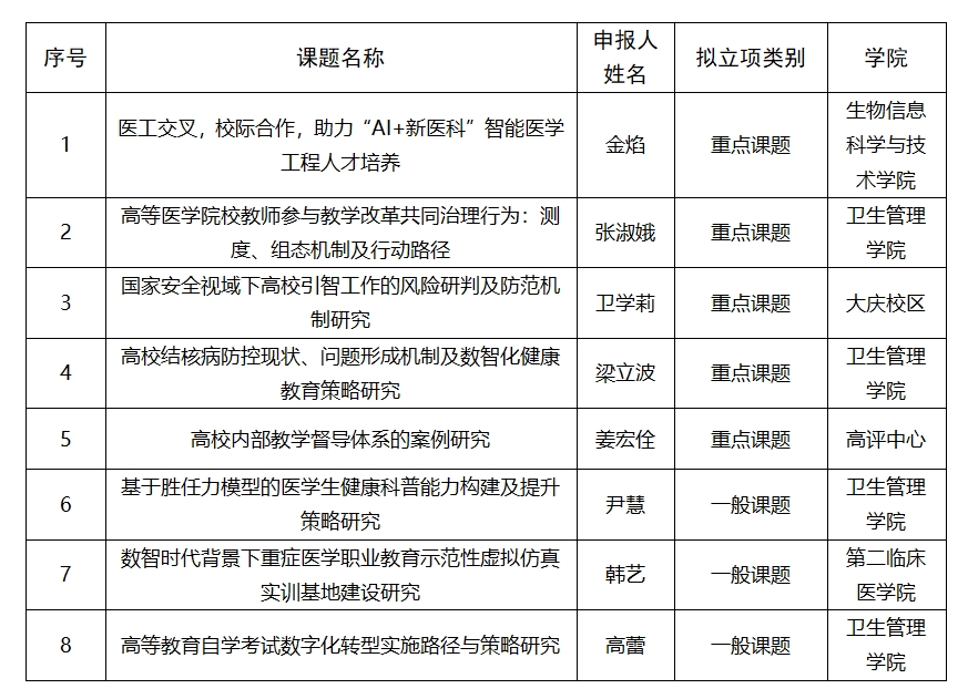 近日,中国高等教育学会公布了“2024年度高等教育科学研究规划课题”立项名单。我校共获批项目8项,取得历史新突破,其中重点课题5项,一般课题3项,在省内高校以及软科排名前十医学高校中立项数量均位居第一。