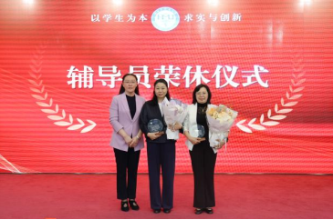 在辅导员荣休与入职仪式环节,公共卫生学院王冶艳老师和基础医学院王玉清老师的荣休视频回顾了两位辅导员的工作点滴,学校为两位老师颁发奖杯、鲜花和纪念品。两位老师送给新入职辅导员钢笔和书籍,寓意薪火相传,托付光荣使命。东梅代表学校向两位荣休辅导员表达敬意和感谢,对新入职辅导员寄予希望和嘱托。