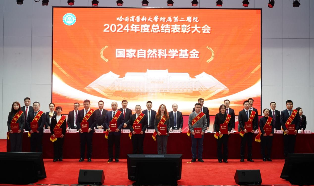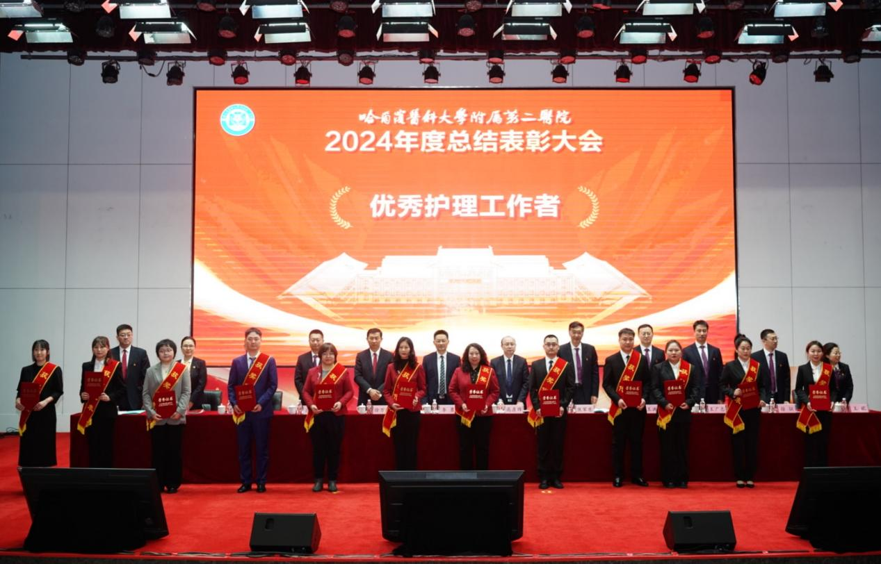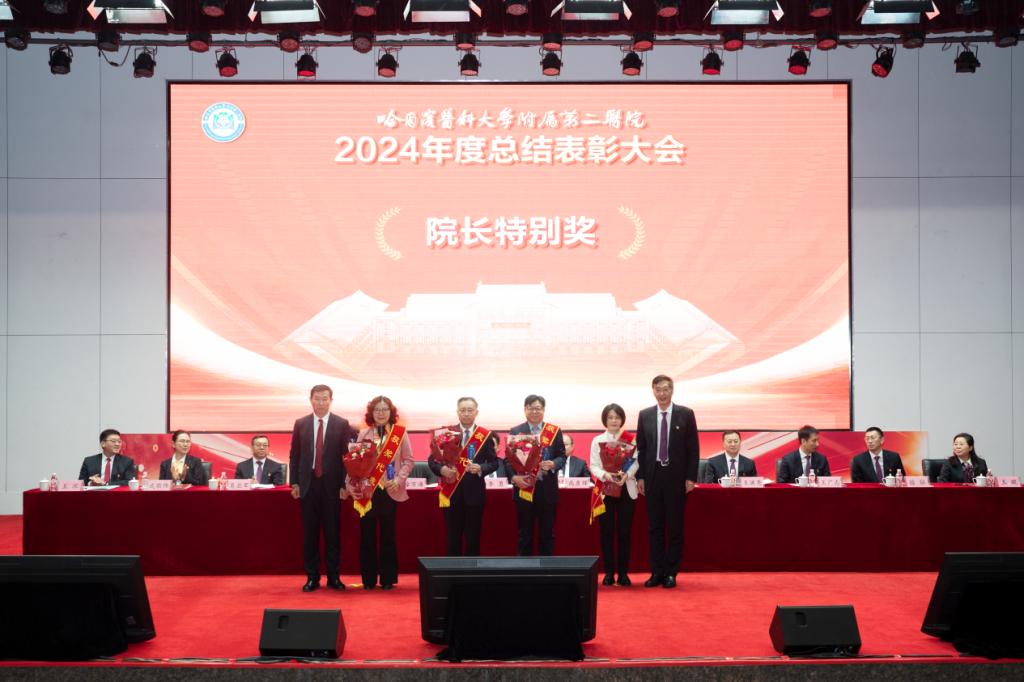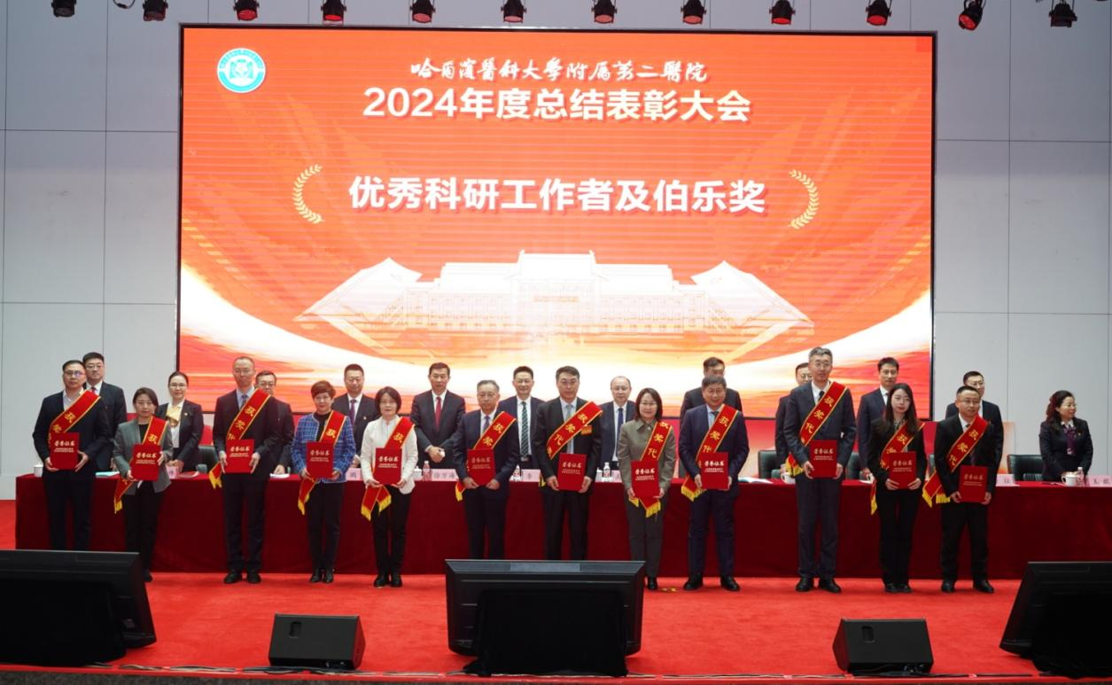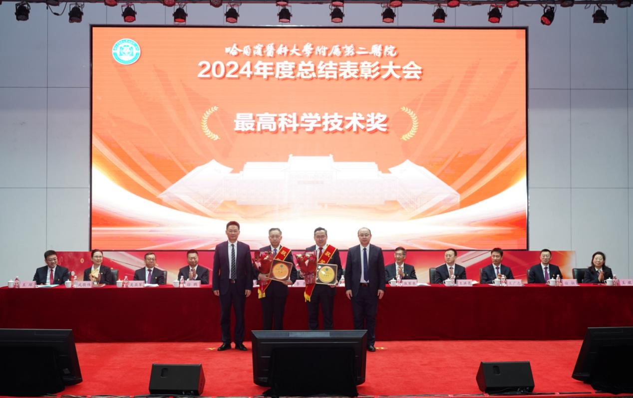 焦军东宣读2024年度表彰奖励文件。校、院领导为最高科学技术奖、院长特别奖、突出贡献奖、国家自然科学基金获得者、优秀科研工作者及伯乐奖、先进教研室及优秀教师、优秀护理工作者、优秀医务工作者颁奖,表彰他们为医院建设和学科发展所做的突出贡献,激励全体二院人向身边榜样学习,开拓进取、再创佳绩。颁奖结束后,哈医大二院心血管病医院院长、心内科主任于波教授和重症医学科主任韩艺教授代表获奖者发言。