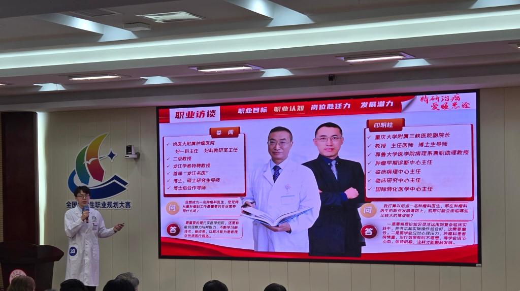 第三临床医学院2024级肿瘤学博士研究生王志强,怀揣“精研治瘤 爱暖患途”的赤诚职业理想,以“用扎实医术守护肿瘤患者健康,成长为临床智慧与科研创新并重的肿瘤科医生”为奋斗目标,在职业规划大赛舞台上惊艳绽放。赛场上,他聚焦肿瘤诊疗前沿,结合临床实践与科研探索,从精准治疗技术钻研到患者全周期健康关怀,从医学难题攻坚到科研成果转化,系统而全面地描绘职业发展蓝图,充分展现出医学研究生扎根专业、心怀大我、服务社会的崇高追求。