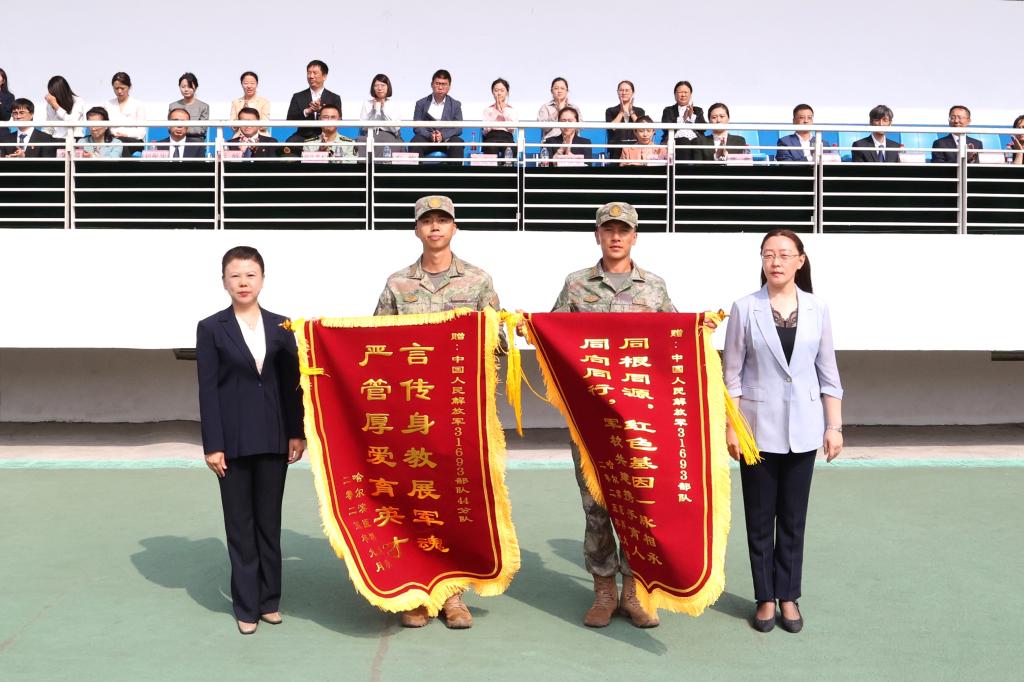 东梅、张明宇代表学校向承训部队及官兵赠送锦旗,感谢部队对学校军训工作的大力支持与悉心指导。学校和部队领导为获得表彰的集体及个人颁奖,激励着全体新生以先进为榜样,继续奋勇前行。