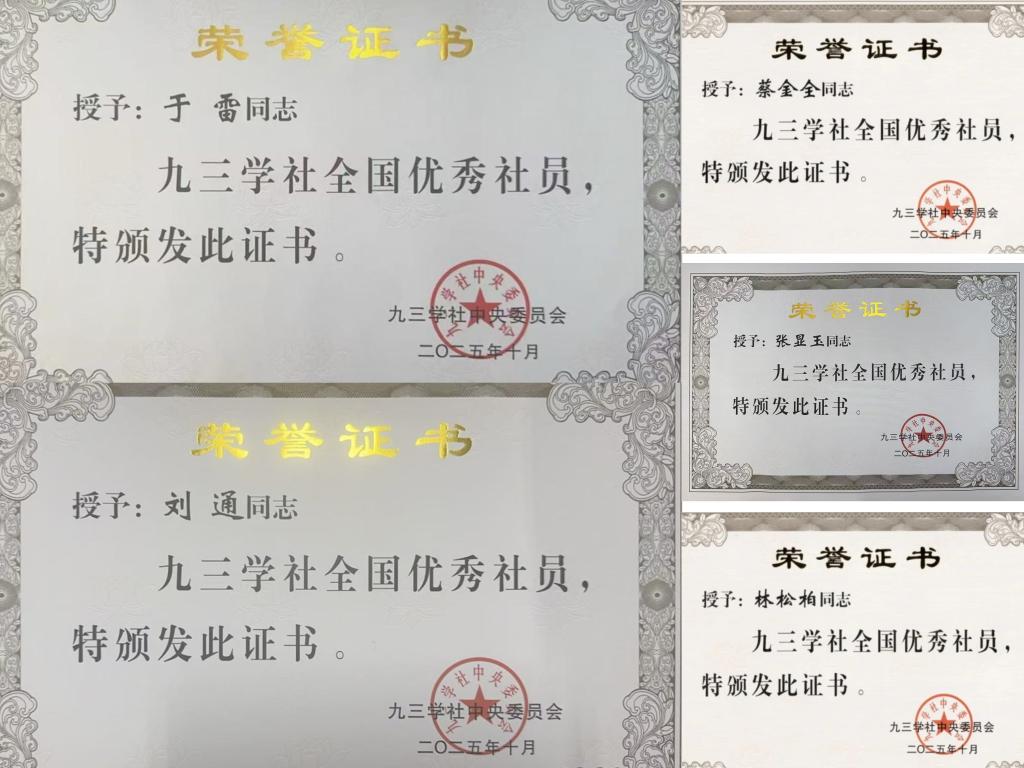 近日,在庆祝九三学社创建80周年之际,九三学社中央委员会印发《九三学社中央关于表彰全国优秀社员、全国优秀社务工作者、全国优秀省级组织和全国优秀基层组织的决定》,对在工作中取得突出成绩的集体和个人进行表彰。我校九三学社社员于雷、刘通、蔡金全、张显玉、林松柏五位同志凭借其在专业领域和党派履职中的卓越表现,荣获“九三学社创建80周年全国优秀社员”称号。