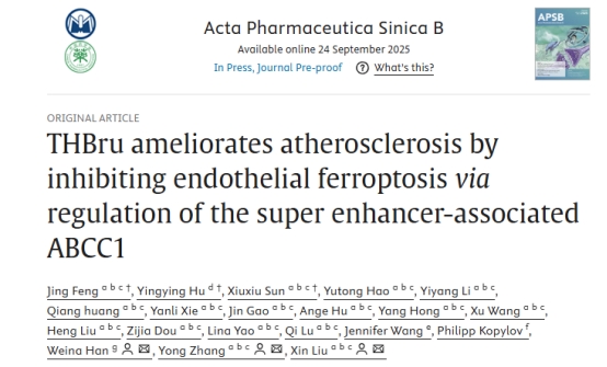近日,我校寒地心血管病全国重点实验室杨宝峰院士团队张勇教授课题组在动脉粥样硬化研究领域取得新进展,研究成果《THBru ameliorates atherosclerosis by inhibiting endothelial ferroptosis via regulation of the super enhancer-associated ABCC1》被国际知名药学期刊《Acta Pharmaceutica Sinica B》(影响因子:14.6)收录并正式发表。