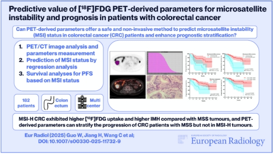 近日,哈医大肿瘤医院PET/CT-MR中心王可铮教授团队的研究成果在国际高水平放射学期刊——欧洲放射学《European Radiology》(JCI一区,中科院二区TOP)重磅发表。该研究基于多中心临床数据,深入探讨结直肠癌(CRC)患者术前PET衍生代谢参数对病灶微卫星不稳定性(MSI)状态的无创预测价值,并通过MSI状态开展亚组分析,进一步评估了PET衍生参数在术后疾病进展中的预后分层作用。