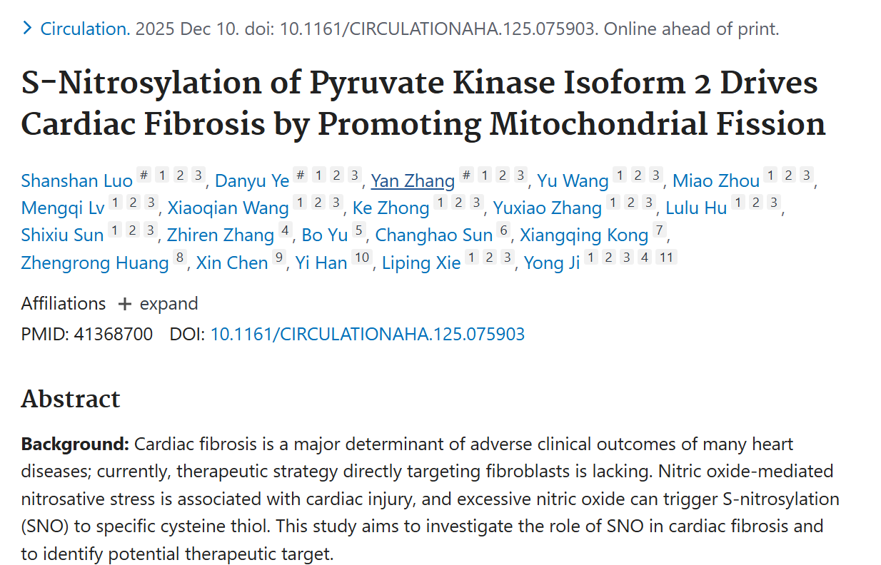 2025年12月,哈尔滨医科大学及南京医科大学季勇教授、谢利平教授和韩艺教授在Circulation发表了题为“S-Nitrosylation of Pyruvate Kinase Isoform 2 Drives Cardiac Fibrosis by Promoting Mitochondrial Fission”的文章。系统分析了SNO-PKM2在心肌细胞和心肌成纤维细胞的表达情况,揭示了其通过诱导代谢重编程和线粒体分裂,促进心肌成纤维细胞活化,并最终导致心力衰竭的分子机制。更重要的是,基于该机制,发现了目前治疗溶血性贫血的药物Mitapivat在抑制心肌成纤维细胞活化,延缓心功能恶化和心衰中的临床新作用,为心力衰竭的防治提供了潜在干预策略。