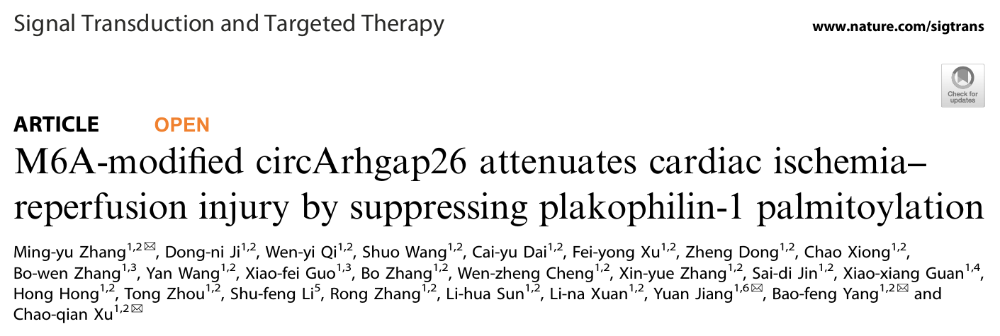 近日,我校寒地心血管病全国重点实验室杨宝峰院士团队许超千教授课题组在心肌缺血再灌注损伤研究领域取得新进展:《M6A-modifed circArhgap26 attenuates cardiac ischemia reperfusion injury by suppressing plakophilin-1 palmitoylation》,被国际知名期刊《Signal Transduction and Targeted Therapy》(IF 52.7)收录并正式发表。