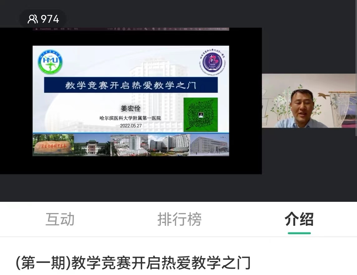 “守初心 促发展”教师成长之路分享会第一期第二讲“教学竞赛开启热爱教学之门”在5月27日顺利开讲,本次主讲嘉宾为第一临床医学院姜宏佺教授。他是首批国家级/省级线上线下混合式一流课程第二主讲教师,荣获首届全国高校教师教学创新大赛二等奖;首届黑龙江省高校教师教学创新大赛暨首届全国高校教师教学创新大赛(龙江赛区)一等奖;全国第五届医学(医药)院校青年教师教学基本功比赛一等奖;黑龙江省青年教学名师;哈尔滨医科大学模范教师。