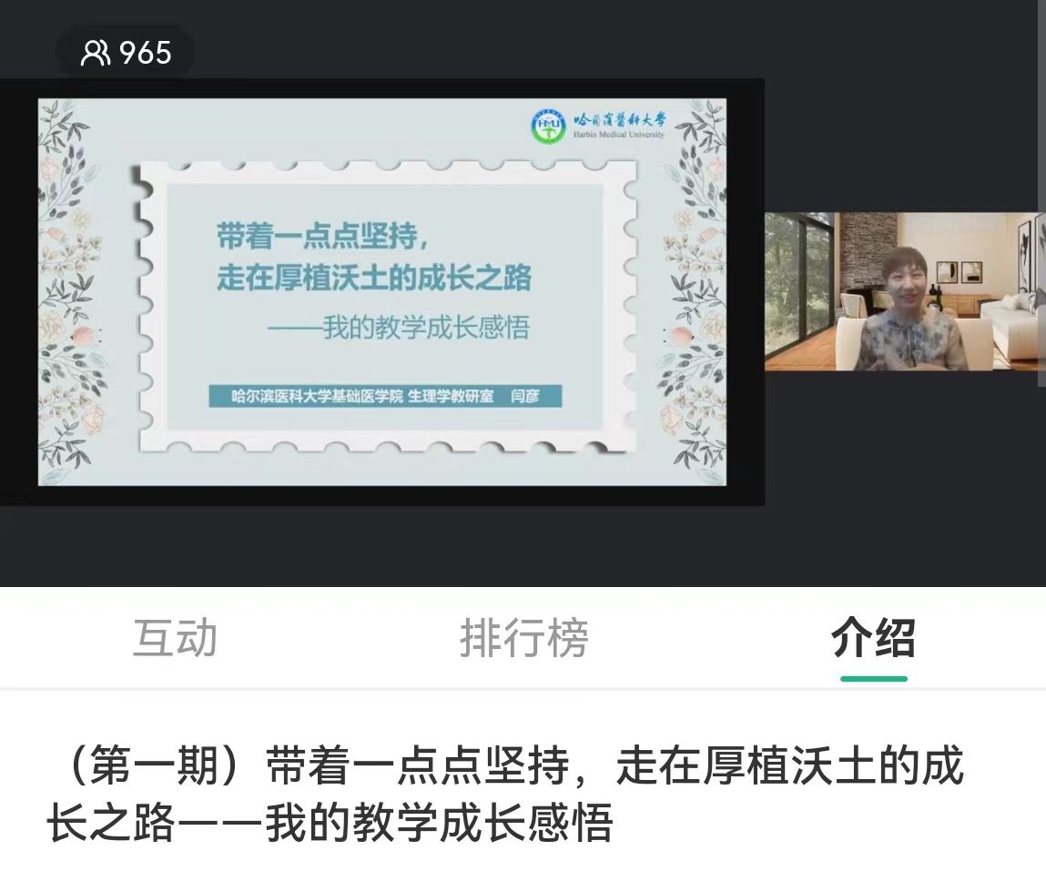 “守初心 促发展”教师成长之路分享会第一期第三讲“带着一点点坚持,走在厚植沃土的成长之路——我的教学成长感悟”在5月31日顺利开讲,本次主讲嘉宾为基础医学院闫彦。她曾荣获全国高等医学院校青年教师教学基本功比赛二等奖、全国高校生理学微课教学比赛一等奖及最佳风采奖,在2022年荣获第二届黑龙江省高校教师教学创新大赛一等奖并将代表我省参加全国比赛。