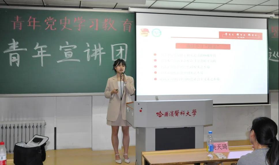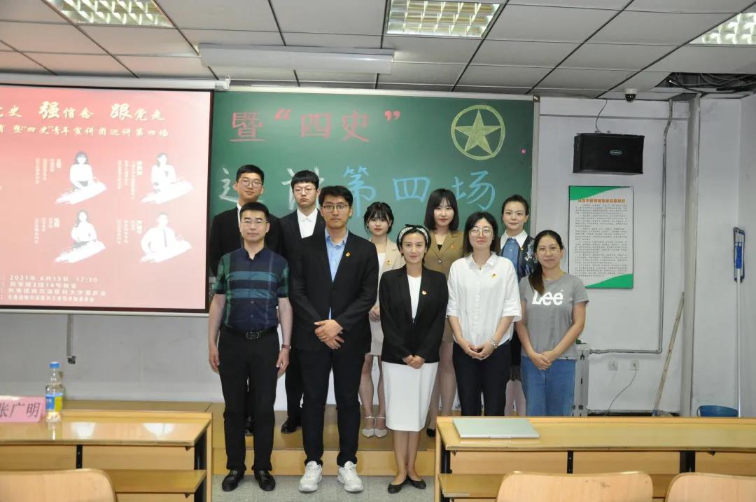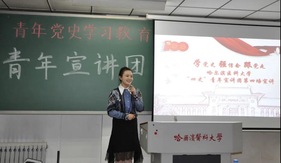 为庆祝建党一百周年,学习贯彻习近平新时代中国特色社会主义思想,从我党百年来辉煌发展历程中汲取智慧和奋进力量,结合学习四史重要指示要求,6月15日,药学院特邀校“四史”青年宣讲团开展第四场巡回宣讲。学院有幸邀请到王雪、谢韵加、张丽、芦俊中四位青年宣讲团代表前来宣讲,为同学们讲述恢宏壮阔的百年党史。校团委宣讲团指导教师姜欢、苗新秀楠参加本次宣讲活动,药学院团委书记王琦、研究生团总支书记张广明,本科生团总支书记庚天琦以及100余名学生代表聆听了本次讲座。