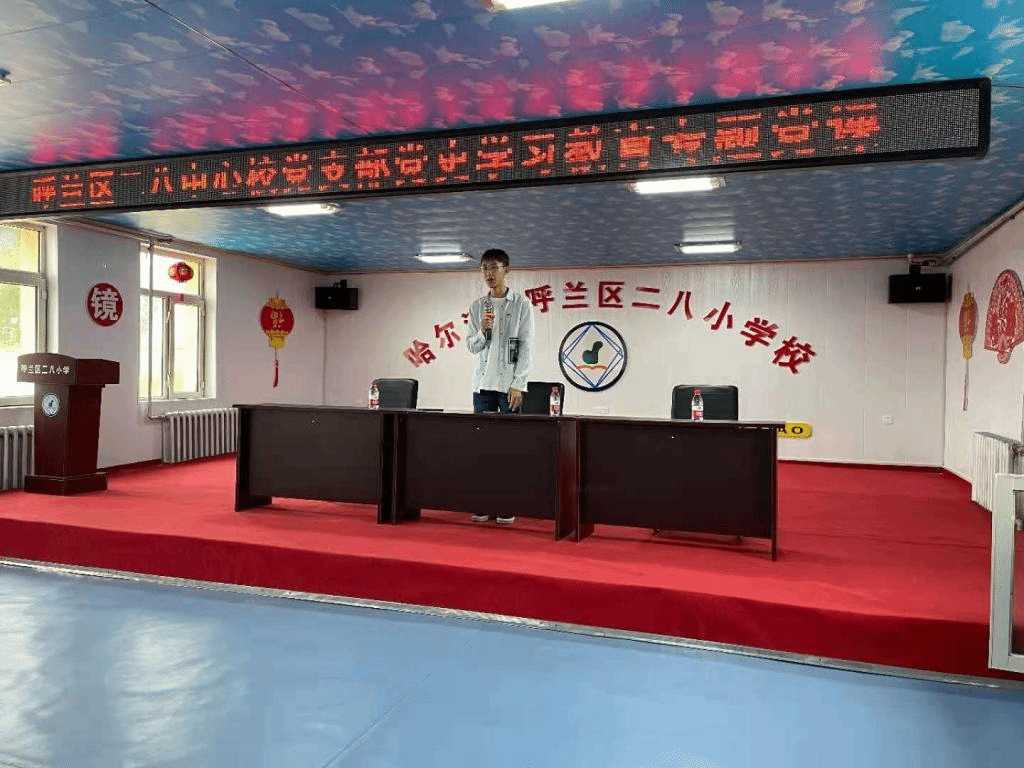 仪式活动上,哈尔滨医科大学青年讲师团成员纪泰行为二八小学的孩子们进行了一期党史宣讲,讲述了红军长征时期的革命故事,再现了老一辈革命家的高尚品德,和坚定的革命信仰与党性原则。