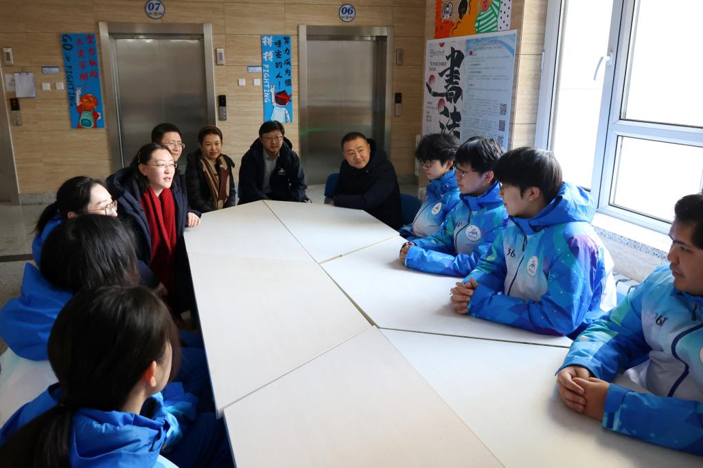 2月11日,在元宵佳节来临之际,受学校党委委托,学校党委副书记东梅一行来到亚冬会开闭幕式场馆和运动员村,看望慰问我校奋战在服务保障一线的亚冬会志愿者和医护工作者,为他们送去节日的问候,并对他们在亚冬会志愿服务期间的辛苦付出表示感谢。团市委书记周成刚现场介绍志愿者工作情况,表示志愿者工作责任重大,要用心做好每一件“小事”,展示志愿者的风采,积极传播良好国际形象。