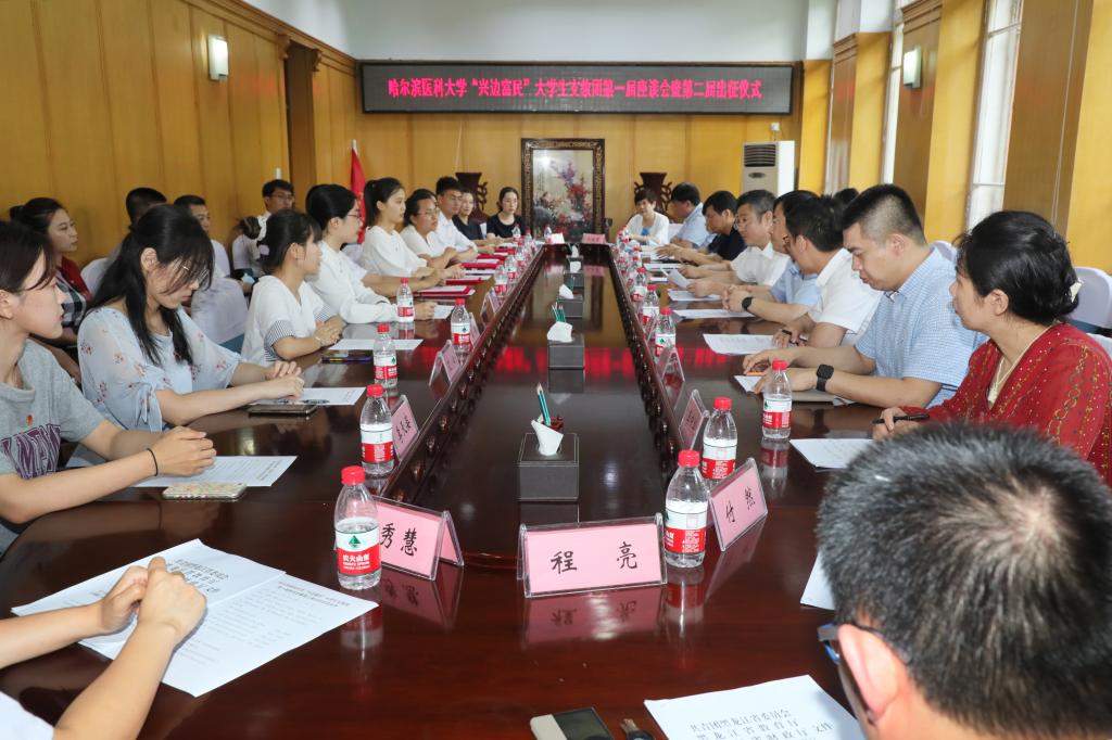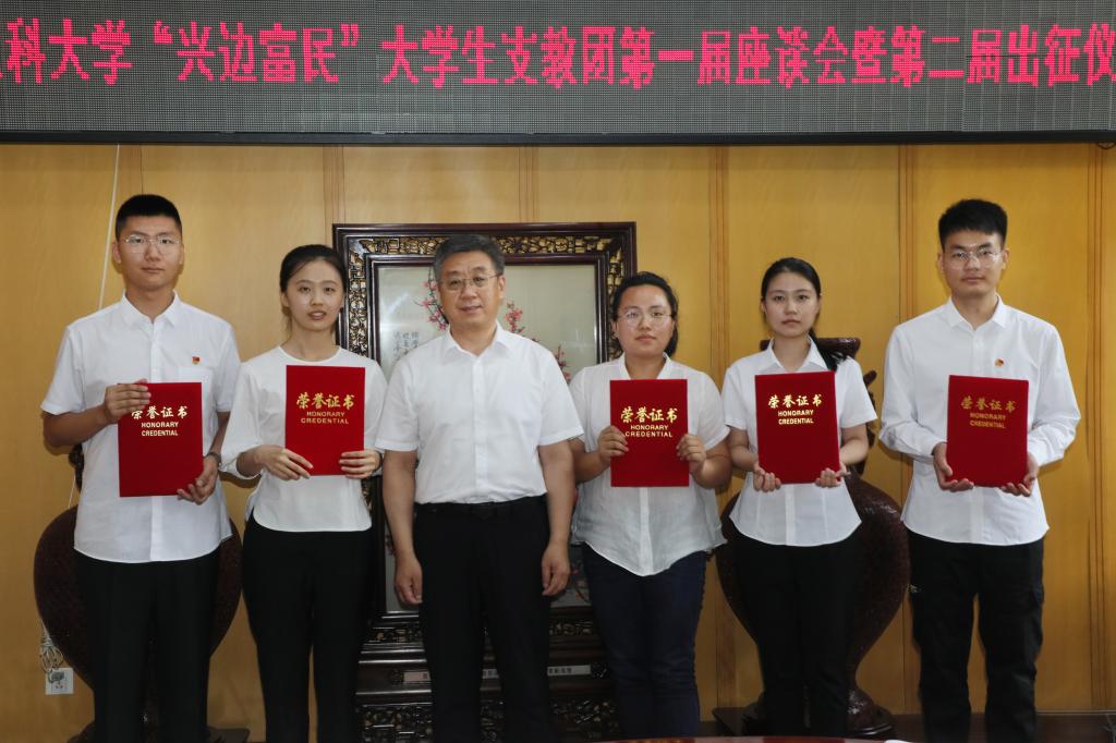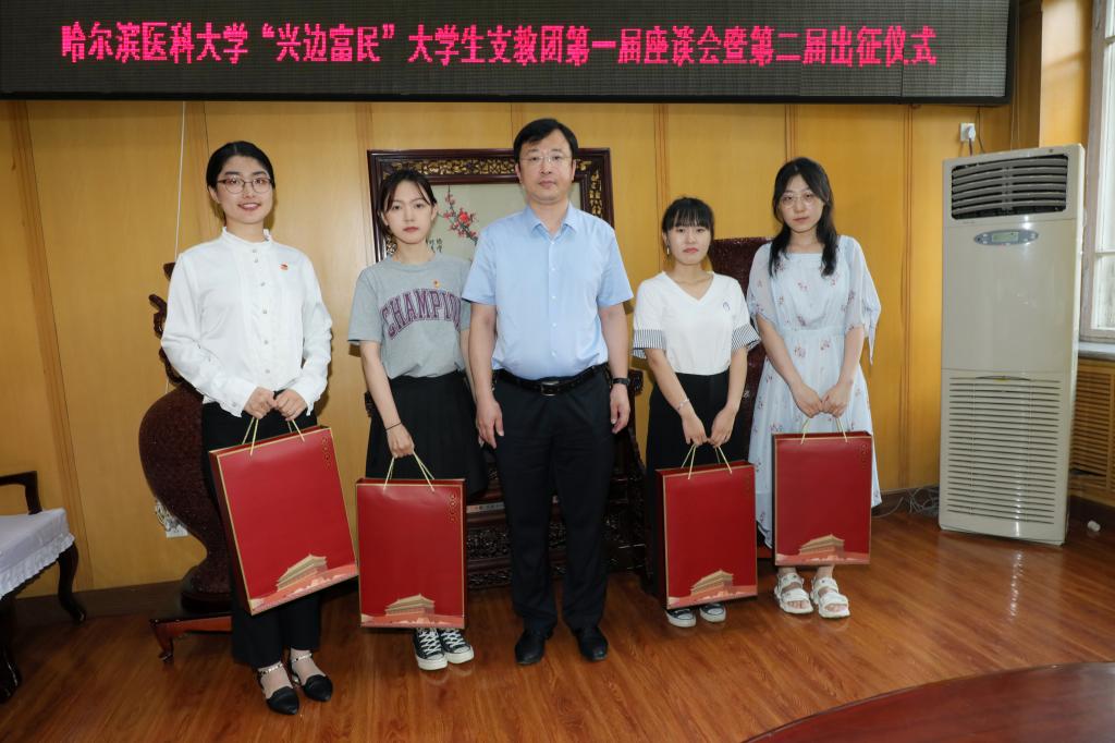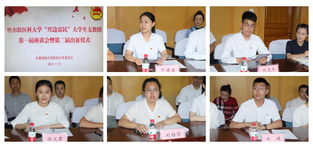 为贯彻落实团省委、省教育厅、省财政厅、省人力资源和社会保障厅、省民族宗教事务委员会五部门联合发文《关于印发<关于黑龙江省青年志愿者助力兴边富民计划大学生支教团的实施方案>的通知》要求,7月21日校团委在主楼二楼大会议室组织召开了哈尔滨医科大学“兴边富民”大学生支教团第一届座谈会暨第二届出征仪式。校党委副书记袁重胜、副校长赵光、副校长许超千、学校宣传部、教务处、研究生院、学生处、马克思主义学院、相关学院主管领导、学院团委书记、第一届支教团成员、第二届支教团成员、导师代表参加了本次会议。会议由团委书记王曦主持。