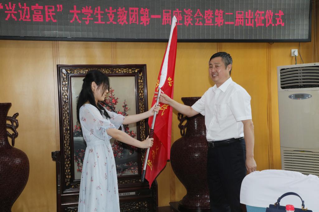 袁重胜为第二届支教团授旗,赵光为第一届支教团成员颁发荣誉证书,许超千为第二届支教团成员出征赠送纪念品。