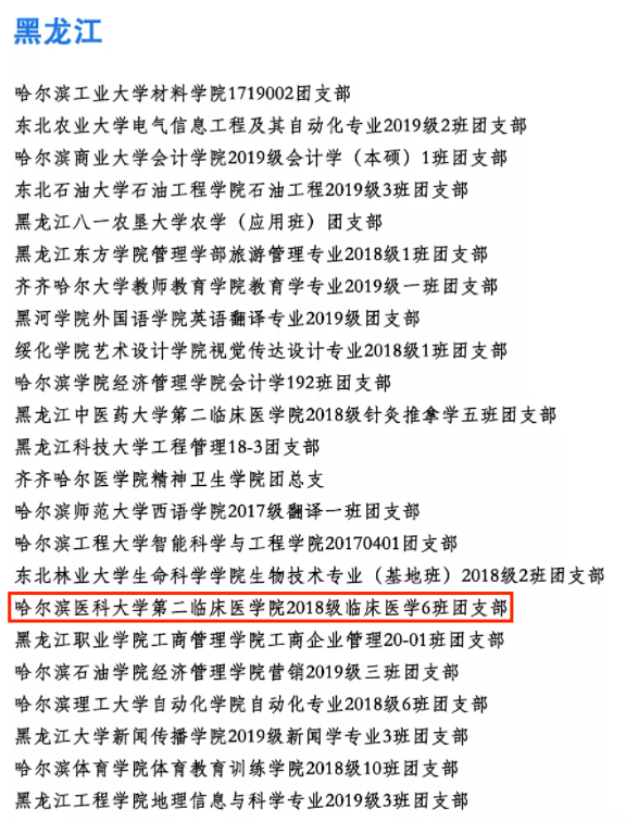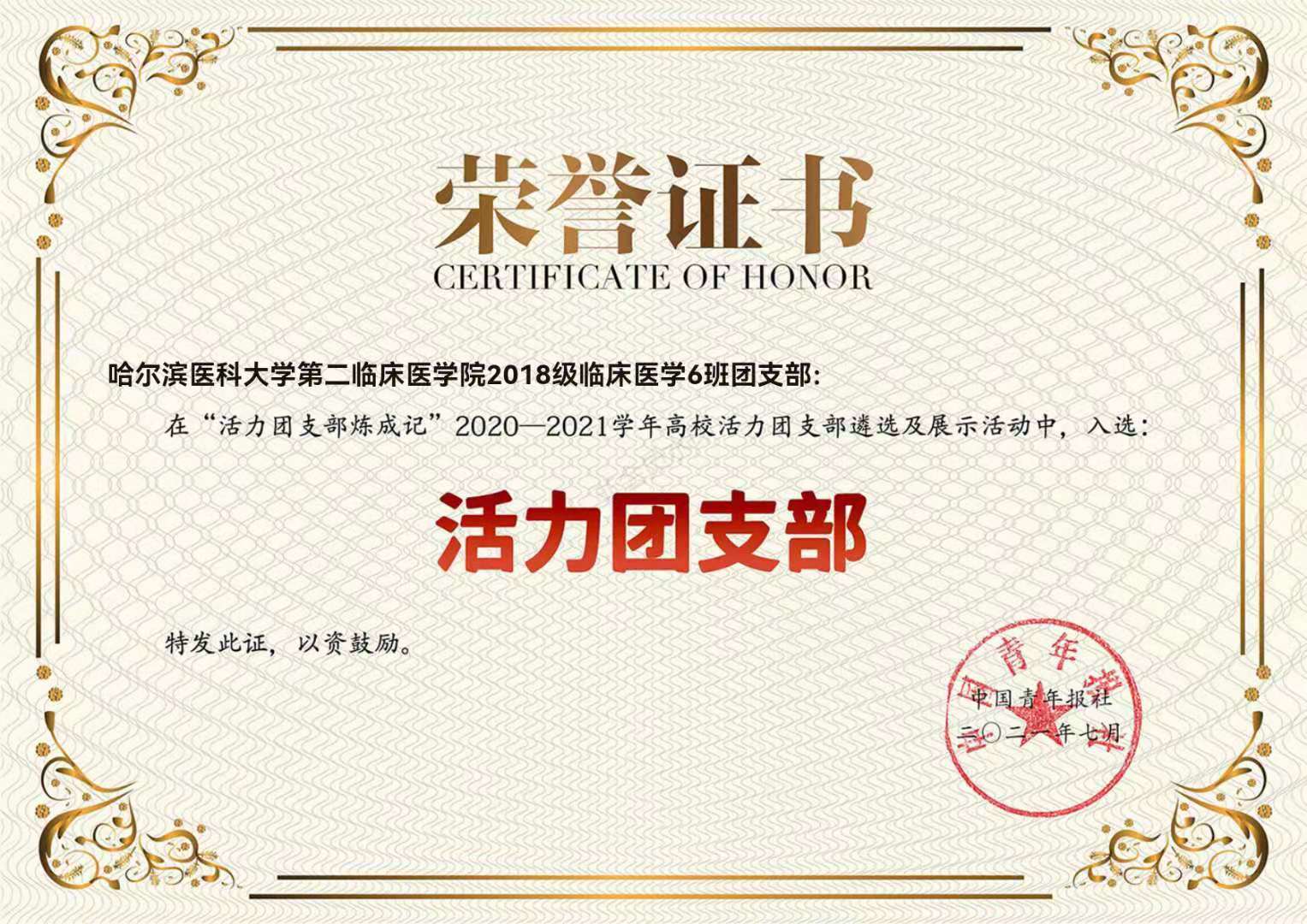 为深入贯彻落实“全团大抓基层”、“全团抓学校”部署,深化高校共青团改革,强化“一切工作到支部”理念,在团中央基层建设部指导下,中国青年报社开展“活力团支部炼成记”2020—2021学年高校活力团支部遴选及展示活动。经校级申报、省级初评、展示点赞、全国终审等环节,共评出1000个高校活力团支部,其中,哈尔滨医科大学第二临床医学院2018级临床医学6班团支部荣获2020—2021学年全国高校活力团支部称号。