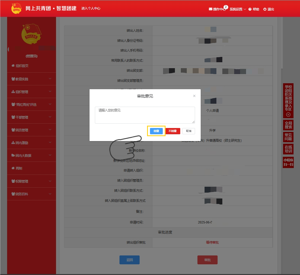 (2)进入此界面后,点击团员信息右侧进行操作“审批”。