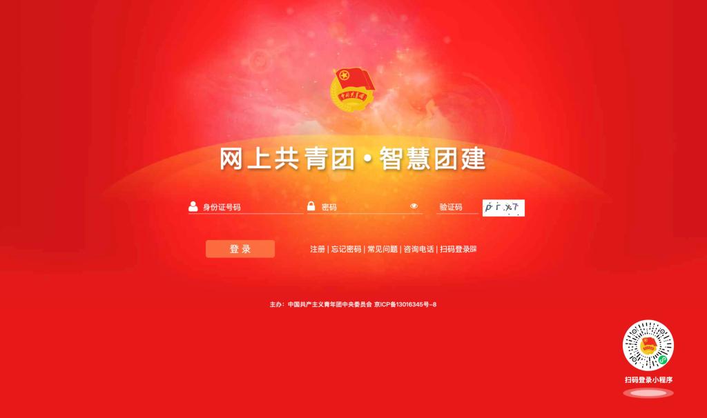 【注】①若显示身份证或密码错误,请联系学院管理员确定本人是否已录入“智慧团建”系统。若确认在系统内,可点击[忘记密码]进行修改,并联系本级或直属上级团支部管理员生成[密码重置码];②建议在电脑PC端登陆。