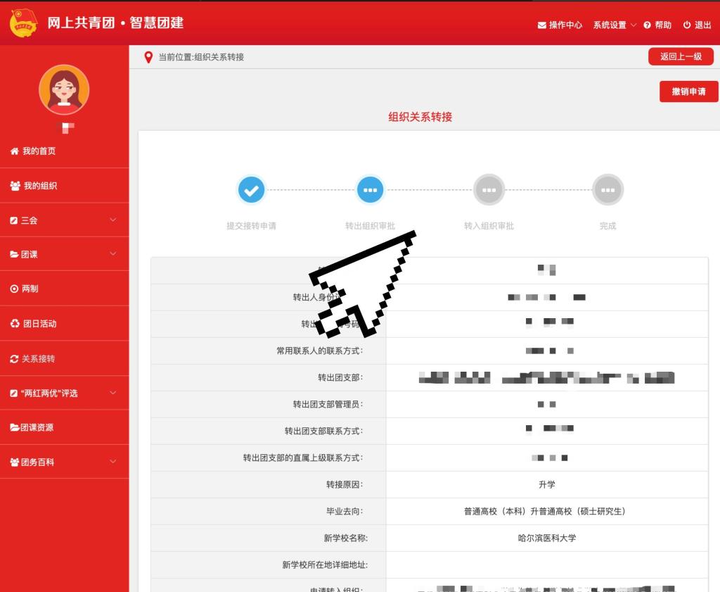 1.若原因为升学,转出组织为录取学校所在学院的具体团组织。