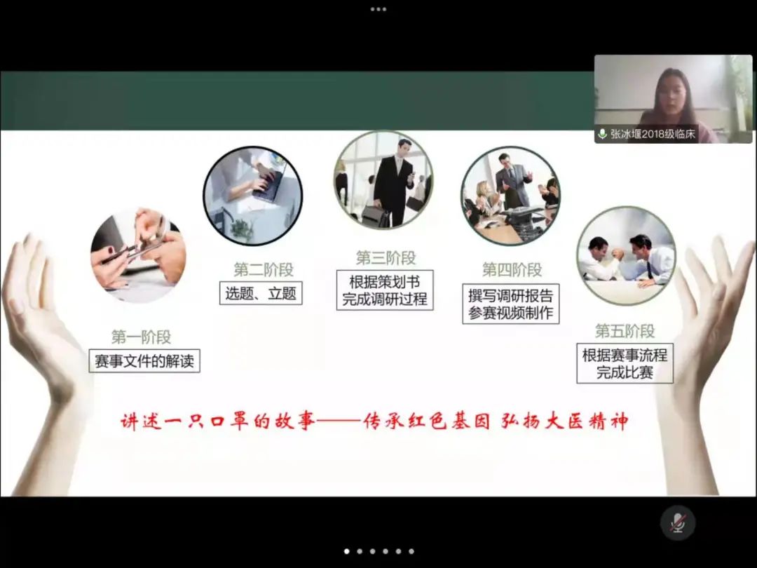 学生代表赵娜(2016级临床本科)张冰堰(2018级临床本科)分别作交流分享,在如何平衡学业时间、找准项目切入点、挖掘社会资源、发扬团队精神等方面,结合学生实际,分享了宝贵经验。