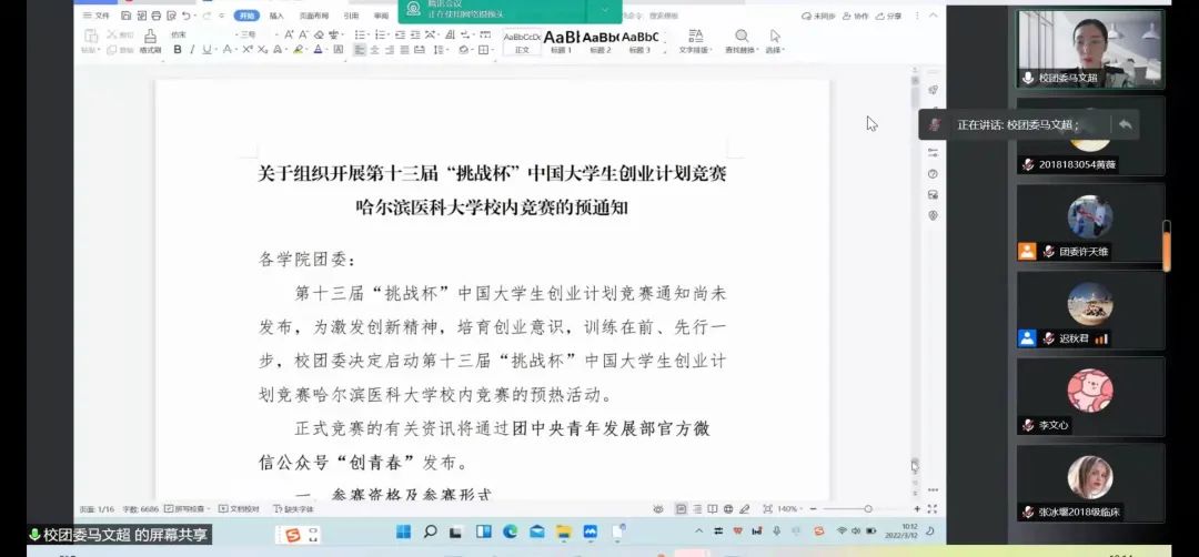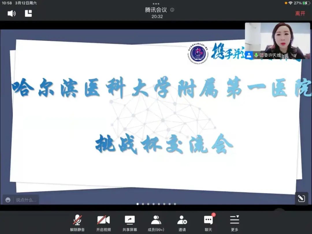 为激发创新精神,培育创新意识,积极响应我校2022年“挑战杯”中国大学生创业计划竞赛的筹备工作,3月12日,哈医大一院团委组织召开了“哈尔滨医科大学附属第一医院挑战杯线上交流动员会”,会议由哈医大一院院团委书记许天维主持,校团委副书记马文超、哈医大一院党委副书记迟秋君参加会议,共计二百余名师生参加本次会议。