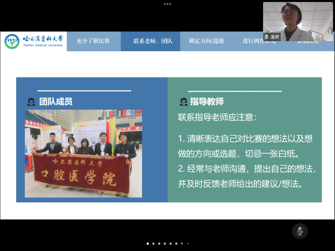 省赛优秀指导教师、口腔牙体牙髓科主任潘爽,受邀分享了指导参赛的心得,从组队、选题、申报、落实、转化的全过程详细介绍了团队的成功经验,动员师生积极参与比赛、倾心投入比赛,在比赛中收获成长。