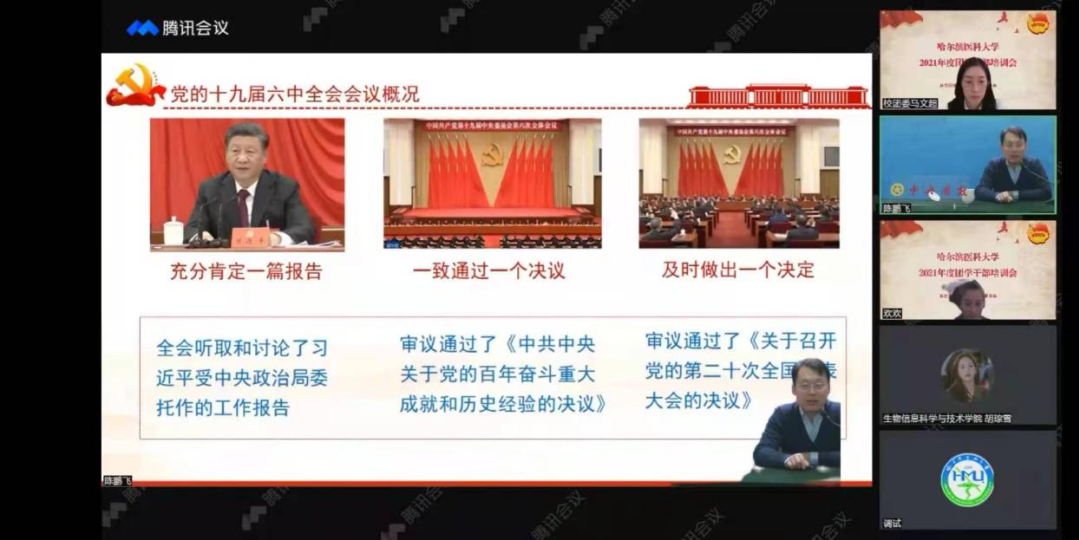 为进一步加强我校团学组织建设,提升团学干部的思想素质,助推团学干部做学校高质量发展的好帮手和广大青年靠谱的青春同路人,12月30日上午,校团委举办哈尔滨医科大学2021年度团学干部培训会。校团委全体成员、各学院团委、团支部共400余名团学干部、第五期青马工程培训全体学员、“百年百人百场讲”理论宣讲员、校院两级学生会及研究生会的全体工作人员参加本次培训,培训会线上进行,由校团委副书记马文超主持。