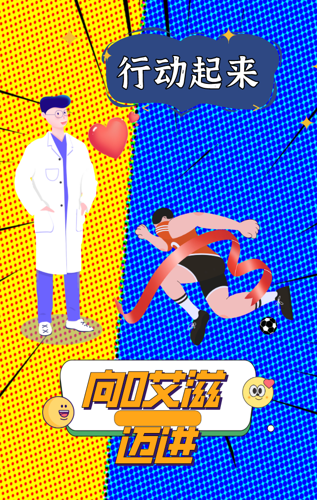 李昊同学为海报取名为《行动起来,向0艾滋迈进》。在这张海报中,医生与上方爱心代表我们对艾滋的防控,右侧运动员通过终点线即向0艾滋迈进,表示我们将终结艾滋的传播。海报向我们传递着“生命至上,终结艾滋,健康平等”的主题,同时也表示艾滋患者能投入到正常生活当中的希望。