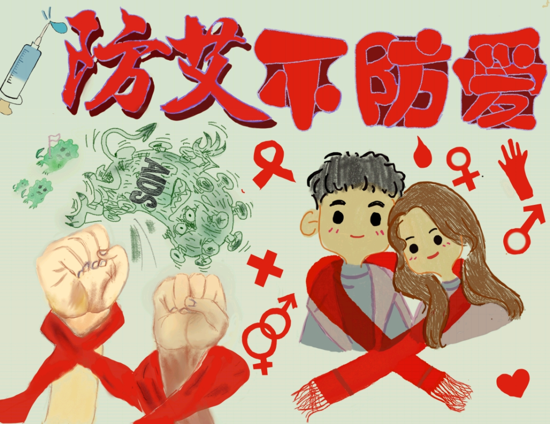 隋东欣同学的作品主题是“防艾不防爱”。她选择利用procreate软件进行手绘创作。以人类的拳头打击艾滋细胞的画面诠释抗艾滋的信念和行动,以一对爱人共同戴上“防艾围巾”诠释人类将携手守护健康的发展。将防艾与不防爱两个分主题结合在一起,表达强烈的抗艾滋的信念。