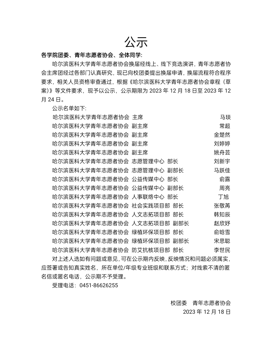 哈尔滨医科大学青年志愿者协会经过各部门仔细研究,现已向校团委提交换届申请,换届流程符合程序要求,主席团候选人资格审查通过,根据《哈尔滨医科大学青年志愿者协会章程》要求,现予以公示。