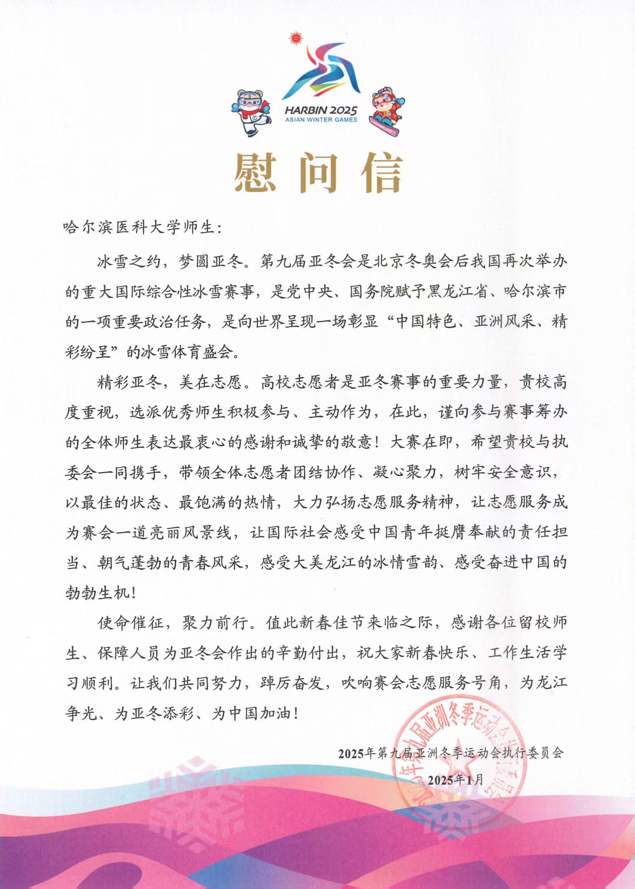东梅表示,为助力我校志愿者们更好地服务亚冬会,为中外参赛人员提供热情、周到、贴心、暖心的志愿服务,连日来,校团委、学工部、研究生院、校园服务保障部和医院管理处等部门认真落实省委教育工委和学校党委要求,为志愿者提供一系列服务保障措施。学校为全体志愿者提供价值四万余元的暖心大礼包,为留校志愿者学生提供学校宿舍、免费早晚餐等保障,为除夕当天在校过年的学生提供年夜饭,并组织志愿者按要求免费接种疫苗。