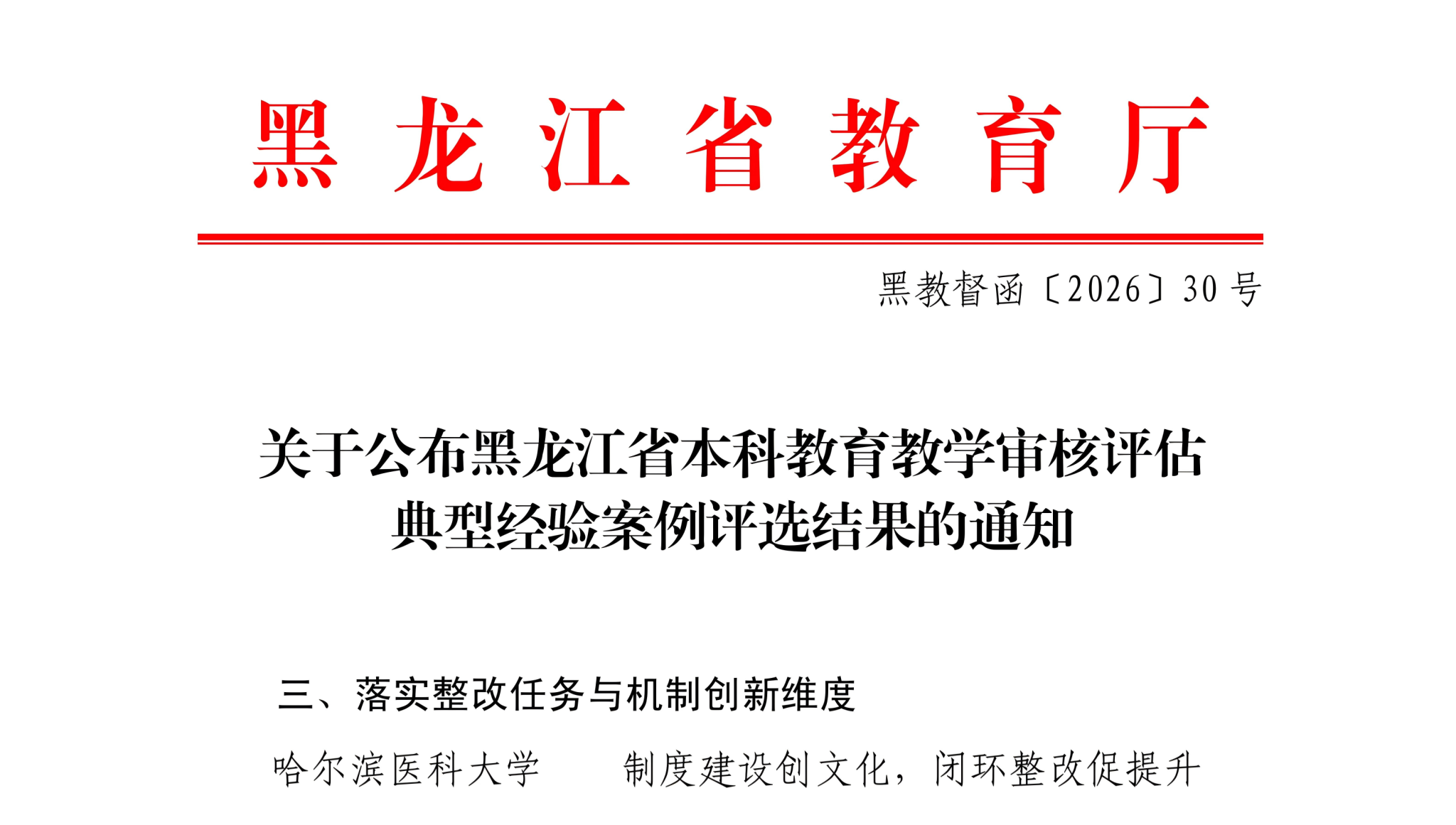 近日,黑龙江省教育厅正式公布新一轮本科教育教学审核评估典型经验案例评选结果,我校申报的《制度建设创文化,闭环整改促提升——哈尔滨医科大学审核评估整改长效建设实践》案例成功入选典型经验案例。此次入选是省教育厅对我校本科教育教学审核评估整改工作成效、机制创新实践的高度认可,更是对学校以评促建、深化教育教学改革、提升人才培养质量工作与成效的充分肯定。
