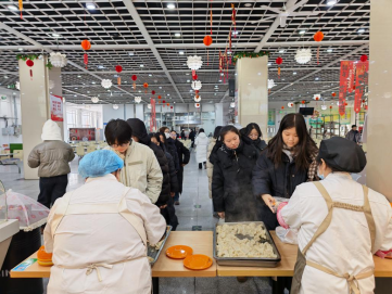 午餐时分,领取水饺的窗口前排起了长队,同学们脸上洋溢着期待与喜悦的笑容。窗口内,四种经典馅料的水饺在蒸腾的热气中散发出诱人的香气,与工作人员一声声“同学,新年快乐”的亲切问候交织在一起,在凛冽寒冬里铺展成一幅生动而温暖的风景。