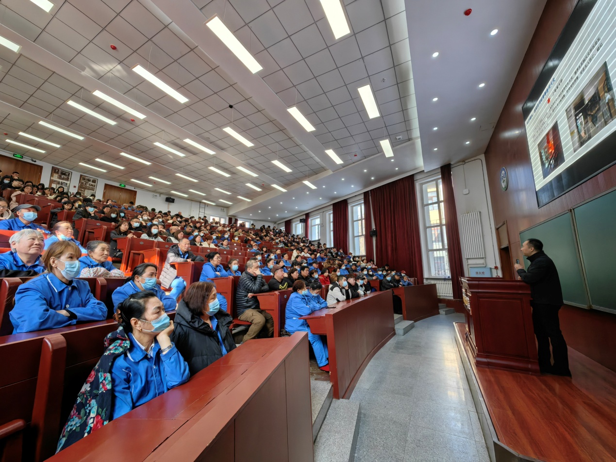 此次培训包括专题讲座、实地疏散和室外灭火演练三部分。保卫处特别邀请道里区消防大队副大队长李海宁为教职员工进行消防讲座。李海宁从消防法律法规、学校消防管理、校园典型火灾案例、应急逃生等方面,用理论讲解与案例分析相结合的方式,为培训人员上了一堂生动、专业的消防培训课。