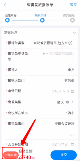 3、差旅报销单在填完职级后需点击左下角【计算补助】,否则补助为0