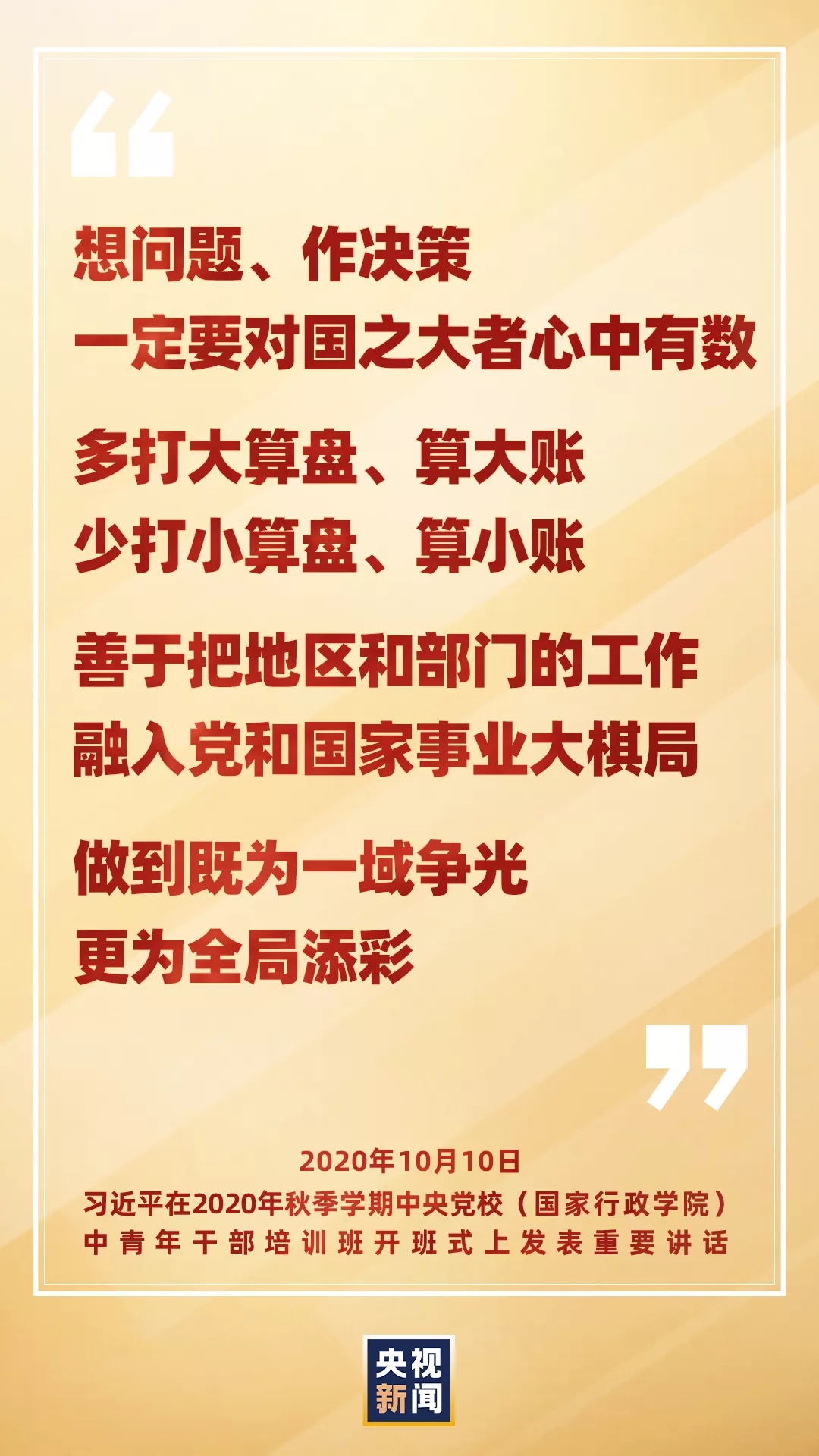 总书记强调,领导干部想问题、作决策,一定要对国之大者心中有数,多打大算盘、算大账,少打小算盘、算小账。