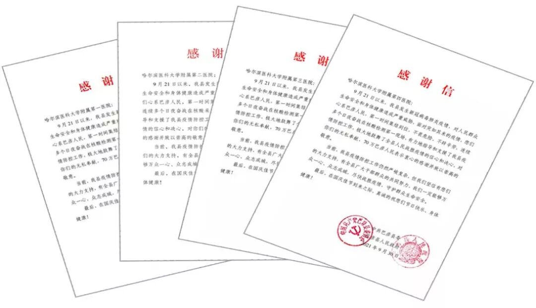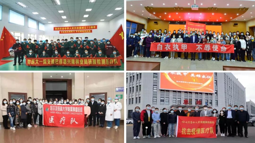 党旗所指,心之所向。中秋之夜,哈医大医务工作者火速集结,星夜兼程,逆向而行。附属一院9名队员携带移动方舱实验室设备和试剂前往哈市巴彦县,凌晨两点搭建实验室;附属二院、附属三院分别派出50名护理人员紧急出征,支援巴彦县开展核酸采样工作;22日清晨,附属四院派出150名医护人员支援松北核酸采样工作。截至9月27日,哈医大附属医院共派出3500余名医护人员,参与巴彦县、松北区及哈市其他主城区的全民核酸采集、核酸检验工作。国庆前夕,四所附属医院党委分别收到巴彦县委县政府发来的感谢信,来信对哈医大精锐力量的火速驰援与用心守护表达了深深的敬意与感激。